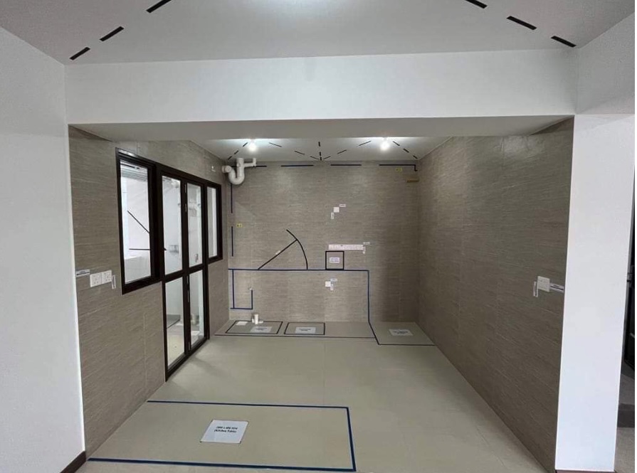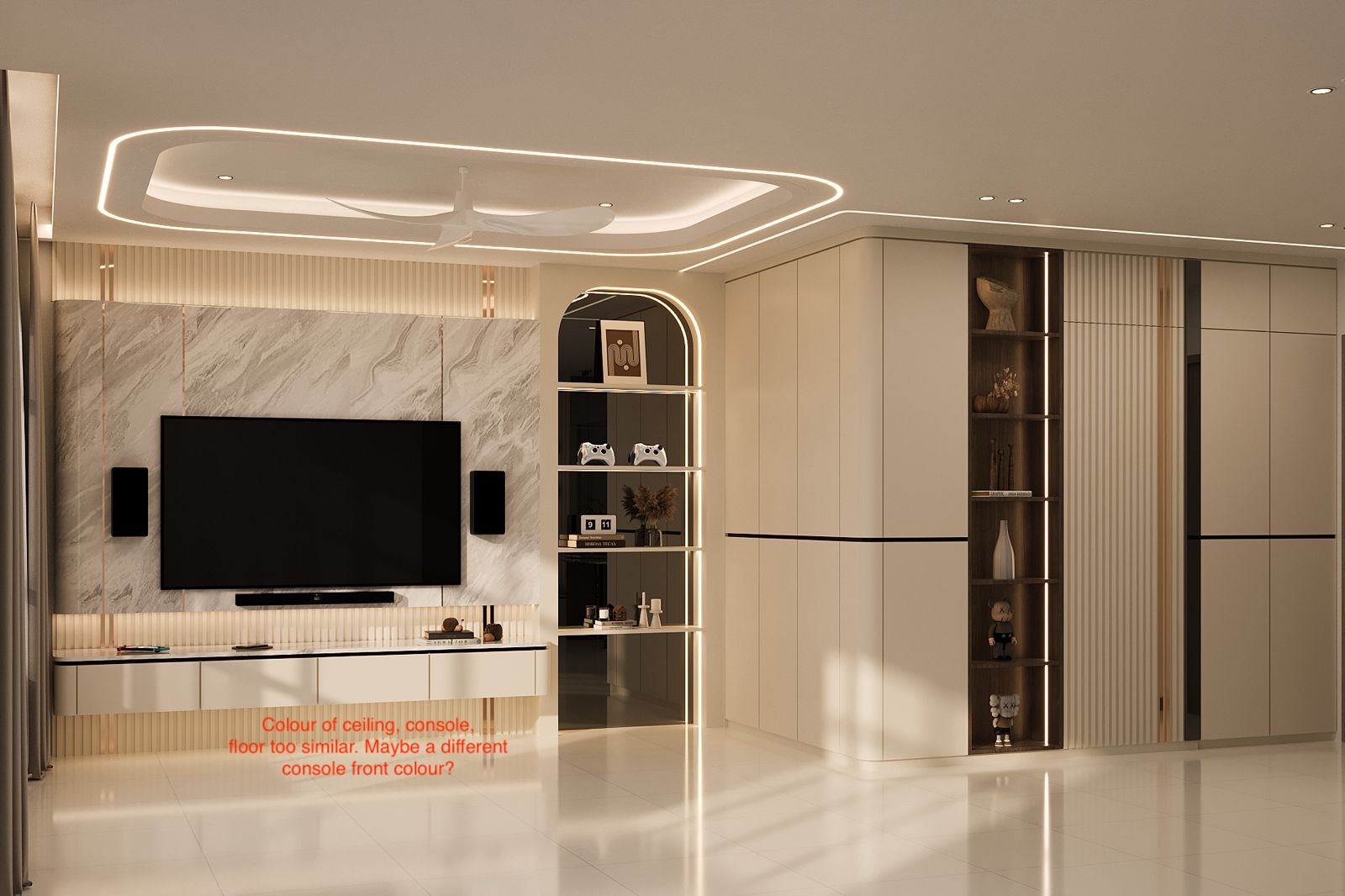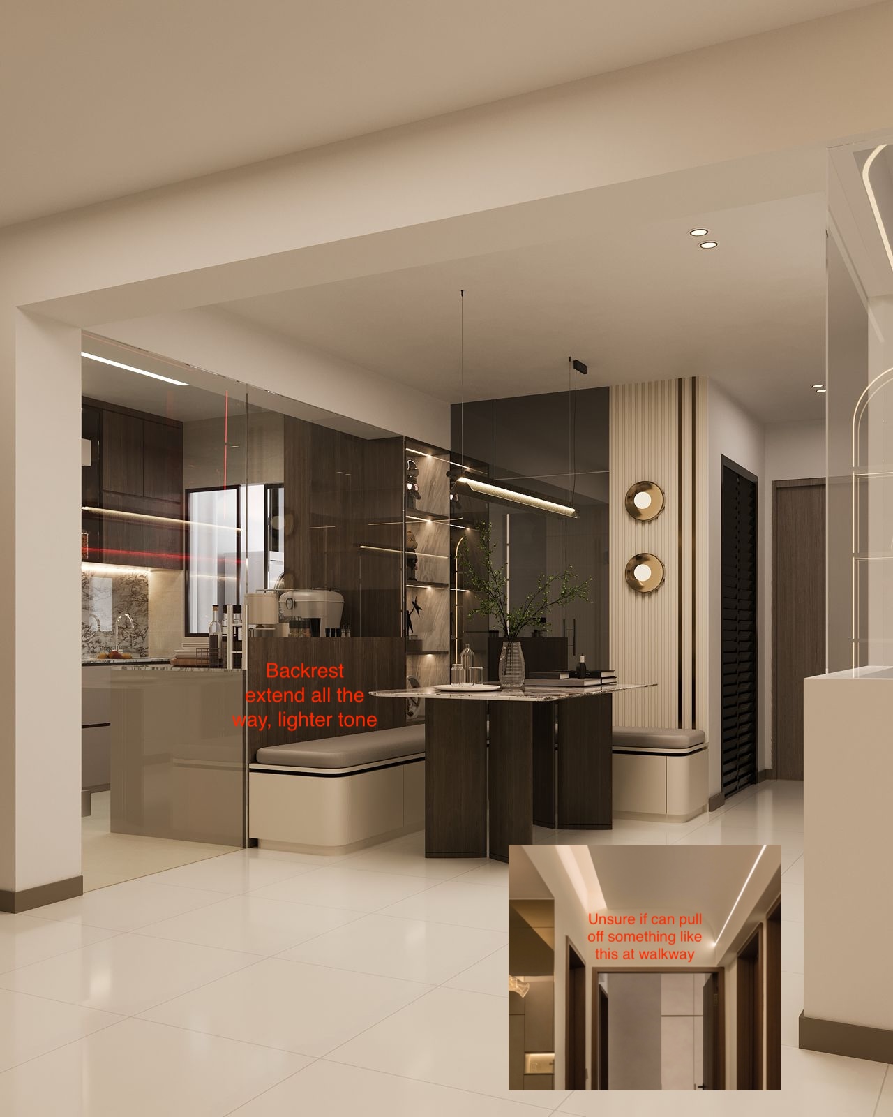 To include wall hanging corner fan at after beam blowing at dining table. False ceiling to cater cutout?