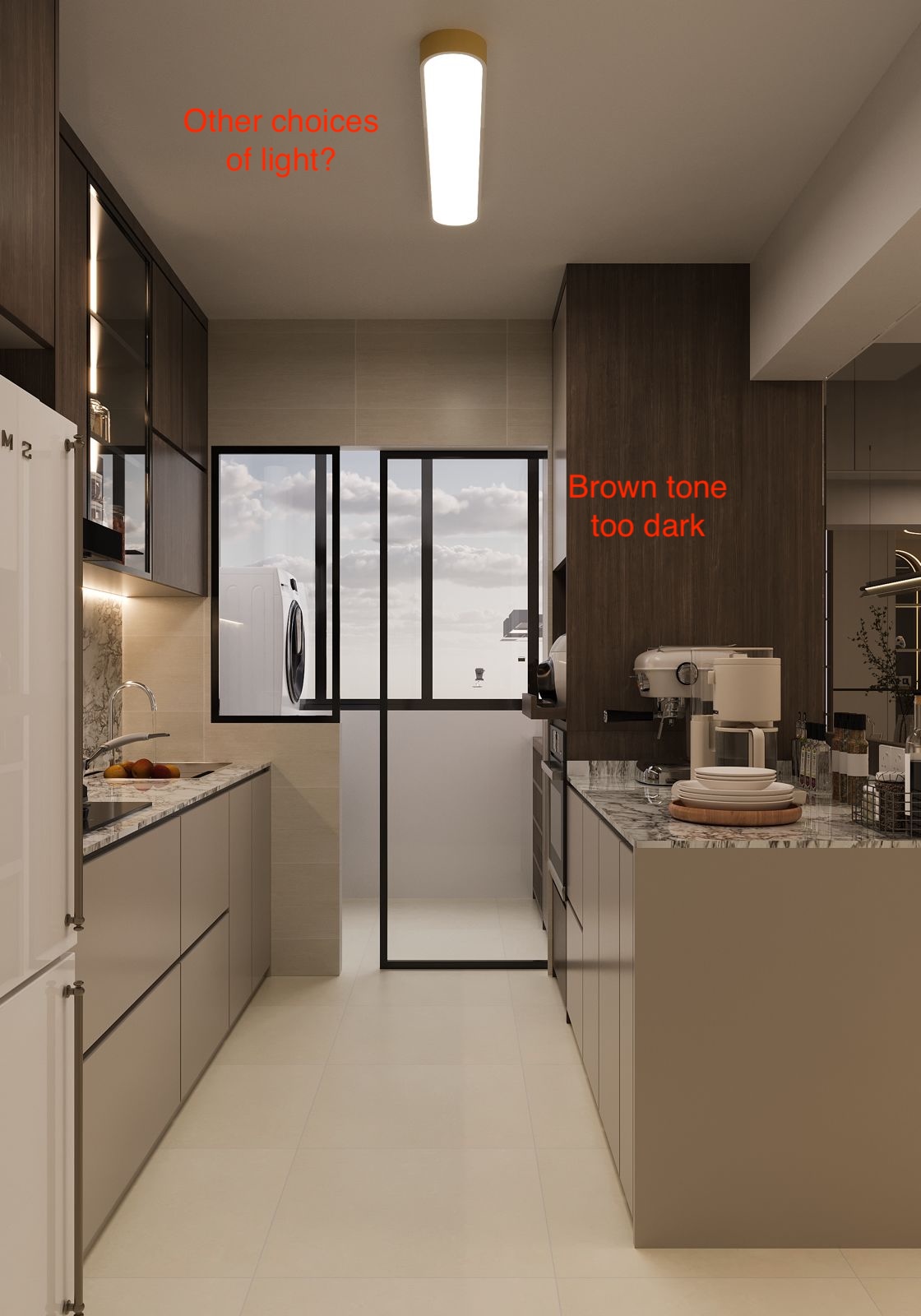 Alicia ok with bright tones, Ray likes the black accents, gold cabinet handles break the monotony (need not specifically be gold)