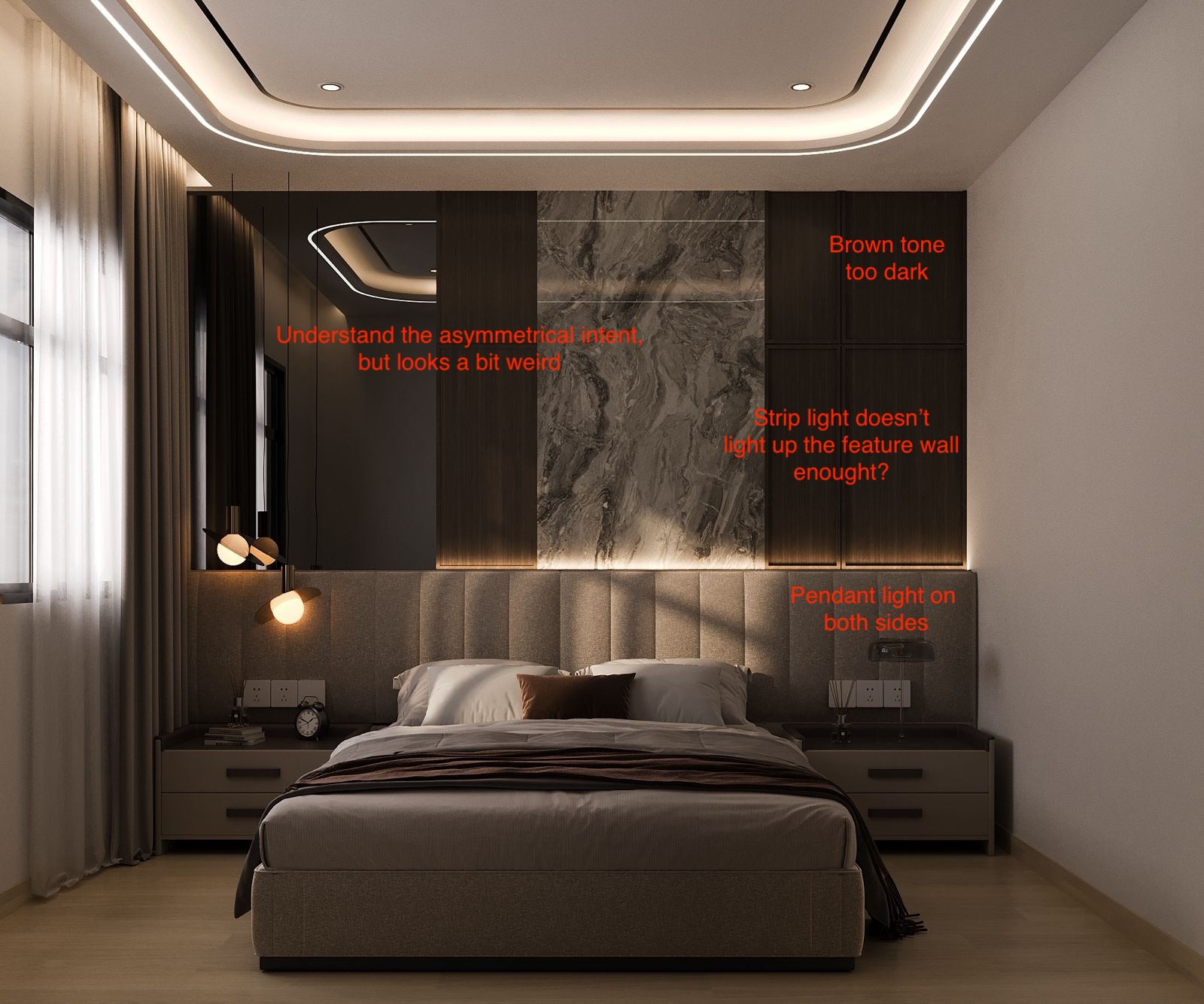 Like the feature wall with its different textures/contrast. Bedside lamp (hanging or attached to wall) creates layered lighting