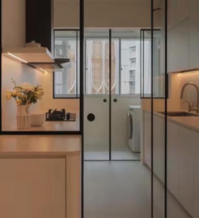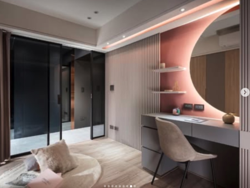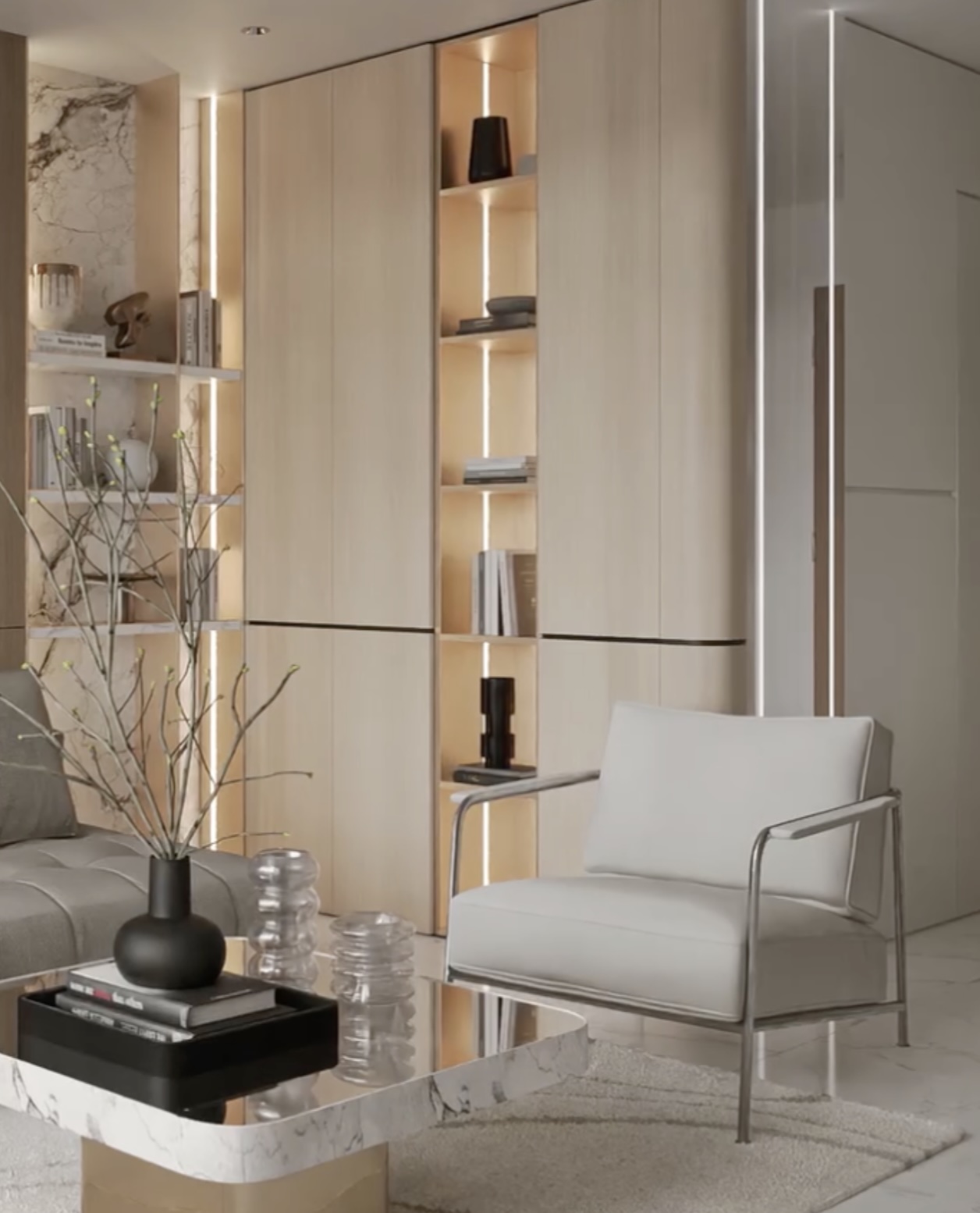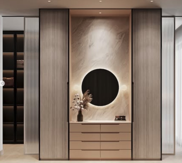 Use of mirrors/marble textures. Black design details adds contrast, no plain walls. A good balance of quiet vs too opulent luxury. Like this tone of wood and also the vertical strip lights in carpentry