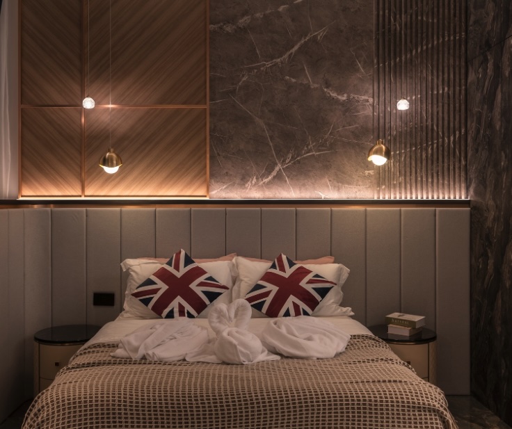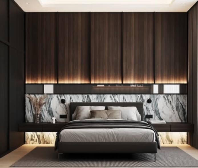 Modern luxe look, less the dark wood panels and dark coloured bedside table