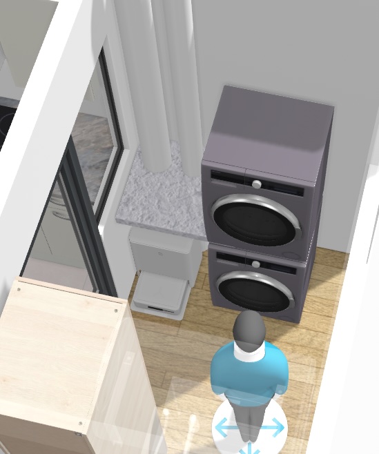 Layout idea for service yard.Left bottom for Robot Vacuum with plumbing (with carpentry to hide robot), right side stack washer and dryer