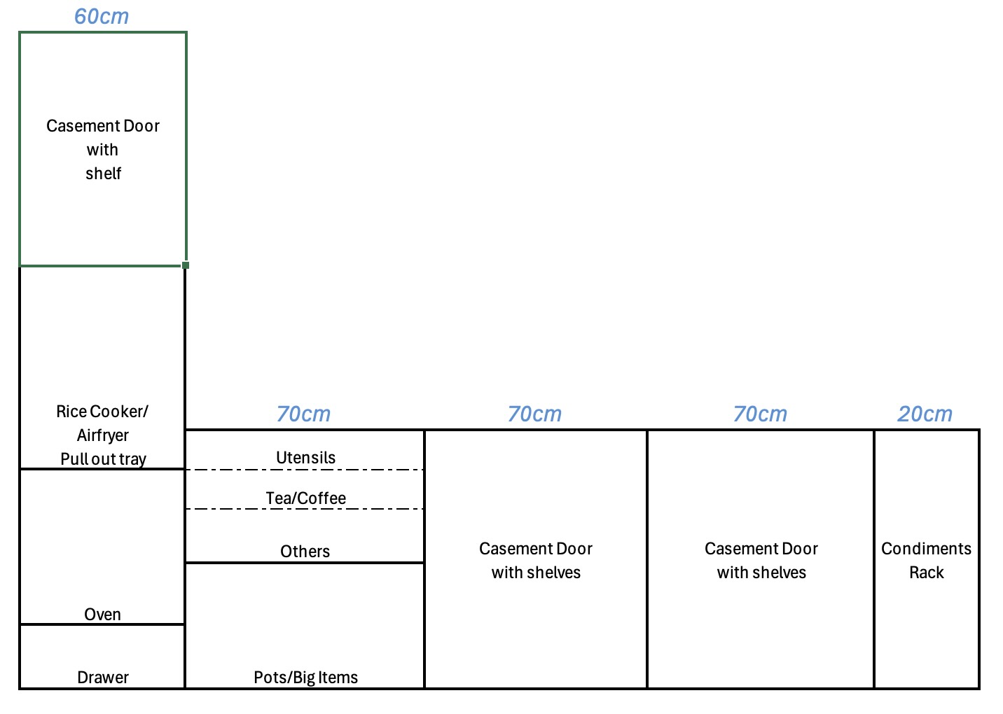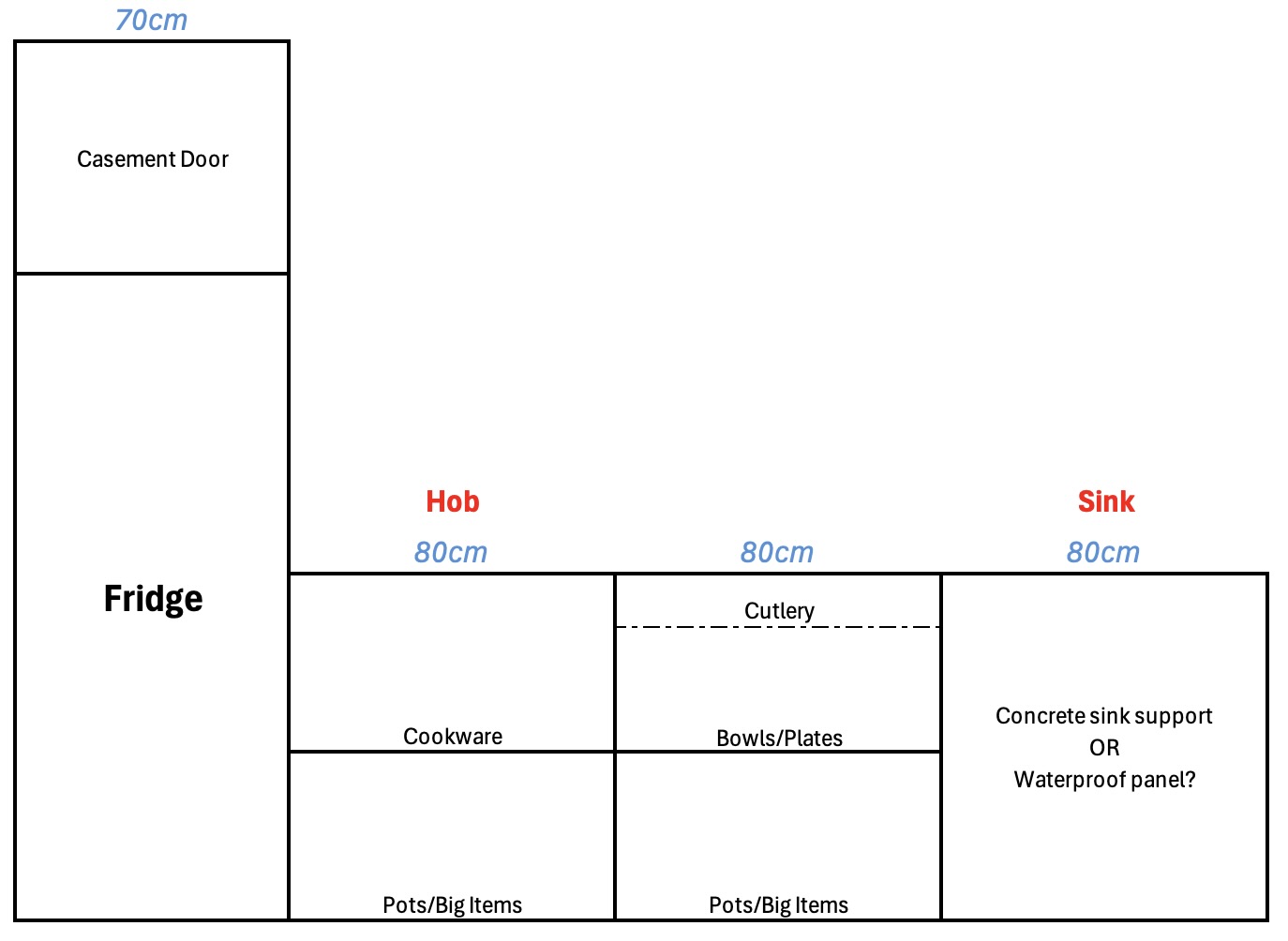 Layout idea for service yard.Full height cabinet with space for Dyson Vacuum, ikea trolley. Unsure can incorporate dustbin pull-out inside also? Below left fluted panel for laundry baskets. Countertop dishwasher placed on top (WxDxH 550x500x590)